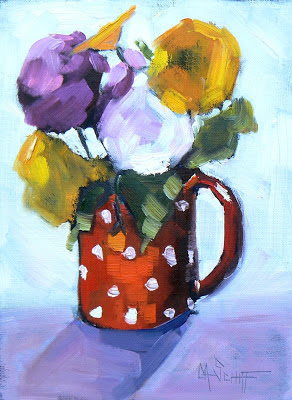Today I am posting another of my small floral still life series.  I think this one is particularly perky with its polk a dot red mug.